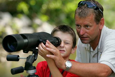 Отец помогает сыну сфокусировать зрительную трубу, чтобы рассмотреть объект поближе